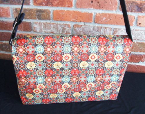 This beautiful laptop bag in made with cotton fabric only the exterior. The interior has a wide pocket for the cords, has interfacing, and padding for protection and 2 magnetic snap to each side.The liner is black.Fits large computers 17 inches screenExclusive design. Vertical Damask style. Heavy duty StrapThe strap is webbing and adjustable of 59" long by 2"wide.The size of the bag is 17" high x 12" wide x 3" inches deep.Custom orders by request available . You choose the fabric we will make it.Thanks for looking.